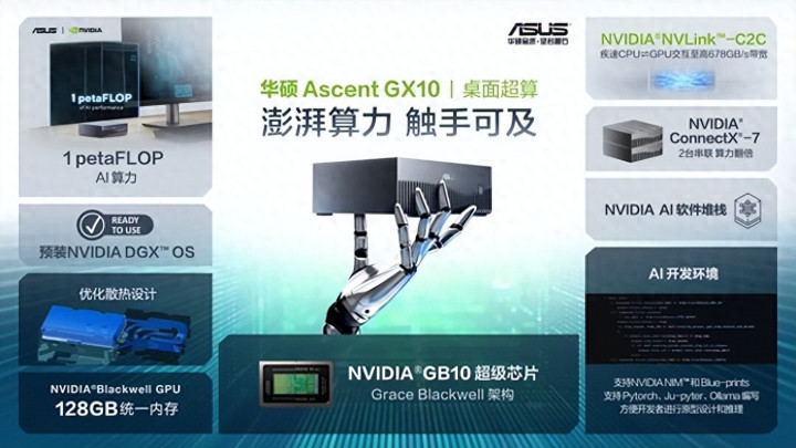 华硕Ascent GX10的登场,彻底改写了高性能计算设备的空间规则。这款仅有150×150×51mm的迷你主机,体积不足传统工作站的十分之一,却能提供每秒1千兆次浮点的AI计算性能。其核心的NVIDIA GB10超级芯片融合了Blackwell GPU与20核Arm架构Grace CPU,通过128GB LPDDR5X统一内存,为大型AI模型训练和推理提供了充沛的内存空间。
